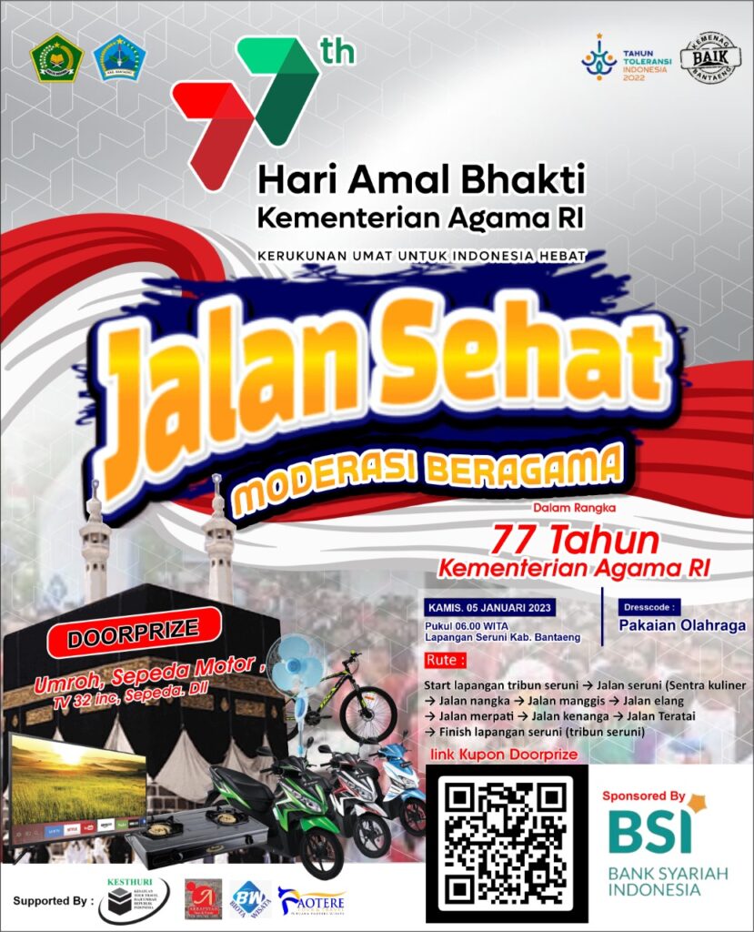 BANTAENG – Warga Lembaga Dakwah Islam Indonesia (LDII) Kabupaten Bantaeng mengikuti jalan sehat moderasi beragama dalam rangka memperingati Hari Amal Bhakti (HAB) ke-77 Kementerian Agama Republik Indonesia di Lapangan Seruni, Kabupaten Bantaeng, Sulawesi Selatan, Kamis (5/1/2023).